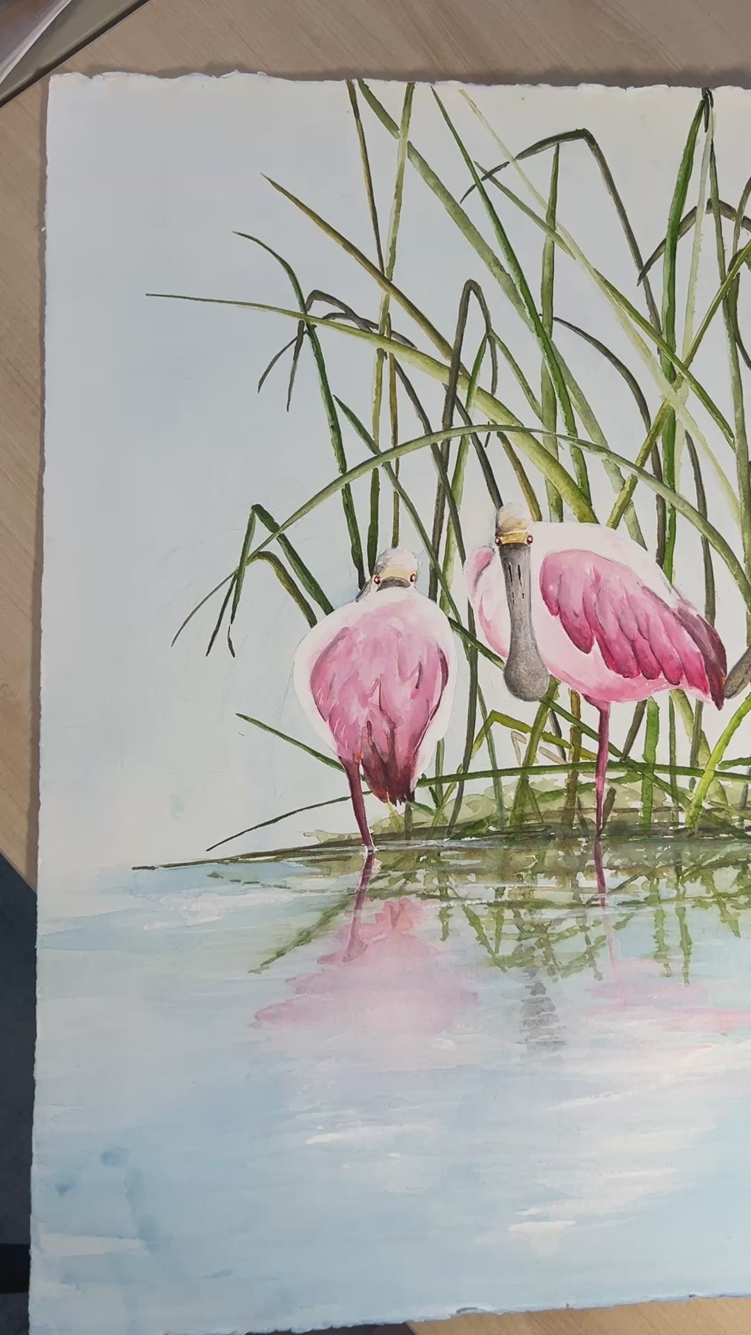 Six spoonbills rest quietly among marsh grasses, their vivid pink forms mirrored in tranquil water below. Bold, expressive washes of rose and coral glow against layered greens and coastal blues, creating a striking balance of warmth and serenity. The reflections double the rhythm of the birds, inviting the viewer into a peaceful marsh moment where color, light, and stillness meet.